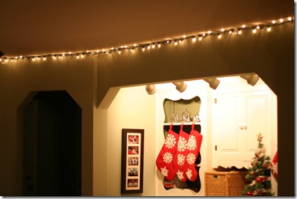 Because our tree is little, we thought we needed more Christmas lights to enjoy. We strung them around the perimeter of the living room, and I LOVE how cozy it feels when it’s dark outside.